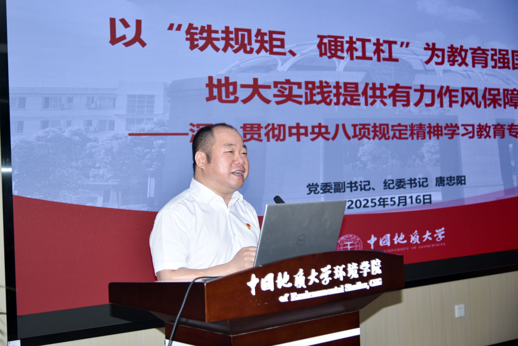 唐忠阳要求,面对新时代新征程新形势新任务,面对高等教育综合改革的新要求新部署,面对学校高质量发展的新目标和师生的新期盼,我们要充分认识到作风建设、抓中央八项规定精神贯彻落实只有进行时、没有完成时,要以开展学习教育为契机和载体,进一步深入学习贯彻习近平总书记关于党的建设的重要思想、关于党的自我革命的重要思想和加强党的作风建设的重要论述以及中央八项规定及其实施细则精神,切实把思想和行动统一到上级部门和学校党委的决策部署上来,以“铁规矩、硬杠杠”和作风建设新成效,为进一步全面深化改革,推进教育强国建设地大实践提供更加坚强更加有力的作风保障。