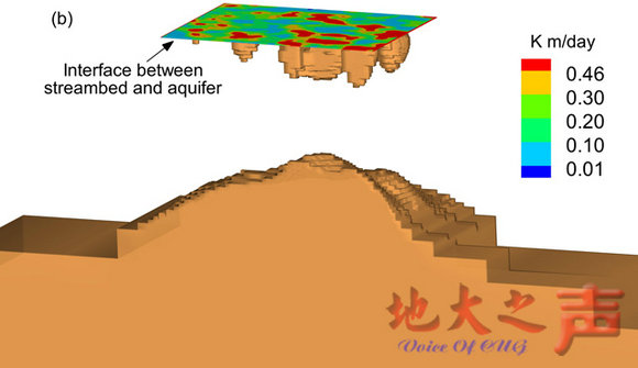 在导师靳孟贵教授的指导下,鲜阳通过采用数值模拟方法,并将模拟结果与以往研究的试验结果反复对比验证发现,对于均质的堵塞层,只有当河流很宽时,该饱和带才与堵塞层完全重合;而当堵塞层较厚,河水很浅,且水面很窄时,该饱和带则形成于堵塞层内部;当堵塞层较薄且渗透性较好,河流很窄且河水很深时,该饱和带则远大于堵塞层所在范围,形成于堵塞层之下。对于自然界普遍存在的非均质堵塞层,河床下则会形成非常不规则的悬挂饱和带,即部分饱和带形成于堵塞层内部,部分形成于堵塞层之下,也有部分与堵塞层完全重合。
