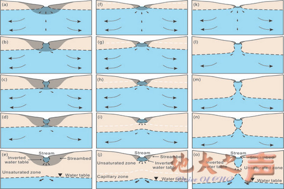 悬挂饱水带发育的三种基本模式,其界面形成于堵塞层内部(图1a-e),