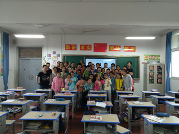 (左图志愿者为小学生发放小礼物,右图为志愿者和小学生合影)