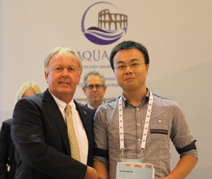 肉视频 博士研究生王家乐同学在第42届国际水文地质学家大会上发表的关于区域地下水流系统的研究成果喜获最佳论文奖。 (张学海编辑) 国际水文地质学家协会主席Ken Howard教授为王家乐颁奖