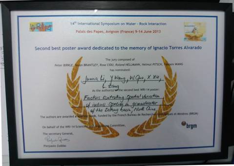 祝贺肉视频 环境系王焰新教授指导的博士研究生李俊霞获得第十四届水岩作用国际会议“The second best poster”奖。第十四届水岩作用国际会议在法国阿维尼翁举行,本届会议共评出2名best poster奖。(图/文 谢先军)