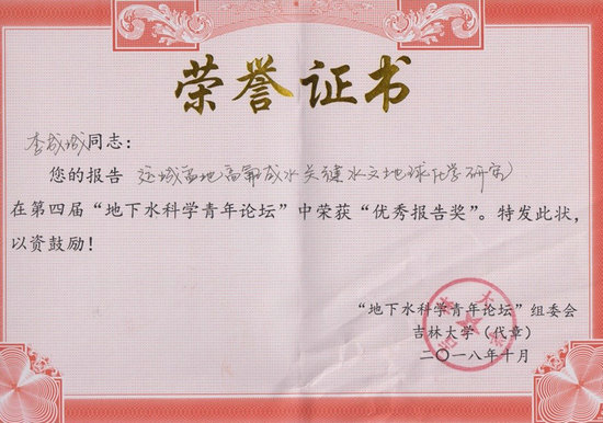 环境科学与工程博士后流动站李成城博士后的“运城盆地高氟咸水关键水文地球化学过程研究”学术报告获得第四届“地下水科学青年论坛”优秀报告奖。