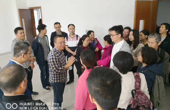 进入环境楼,潘欢迎带领大家从一层到六层,从南楼到北楼,重点介绍了环境楼的功能布局,查看了报告厅、会议室、实验室、办公用房等房间的规划设计和施工情况等。