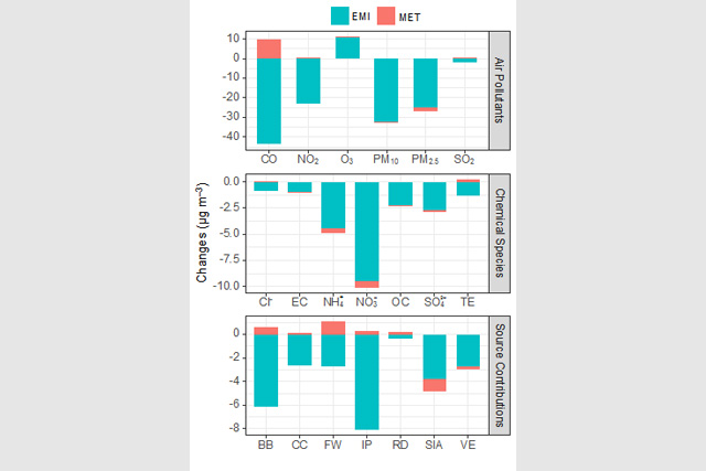 研究对比了2020年“封城”后1个月与2019年同期排放和气象条件对空气污染物、PM2.5化学组分和源贡献变化的影响。武汉市大气二氧化氮、可吸入颗粒物、细颗粒物和二氧化硫质量浓度的降低幅度分别为55.6%、33.7%、37.0%和26.5%。“封城”措施导致的污染物减排使得武汉市PM2.5与2019年同期相比,降低了27微克每立方米,减排贡献为92%,远高于气象条件的影响。PM2.5中不同的化学组分和各类源贡献均有大幅降低。化学组分中硝酸根离子的下降幅度最大,达到9.86微克每立方米。受体模型解析出的PM2.5的7类贡献源包括生物质燃烧、燃煤、烟花燃放、工业过程、道路尘、二次无机源和机动车尾气均有明显降低,工业过程降低幅度最大,为8.02微克每立方米。