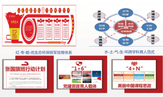 学院党委积极推进党建与人才培养、教学科研等业务深度融合,打造“六红”“六专”“六能”“六心”的新时代生态环保铁军育人工作体系,构建科学高效的治理服务模式。一体化设计、一同推进、一同考核,形成了四同党建文化,即价值取向与党与祖国人民同心、学术方向与政治方向同向、学术卓越与思想卓越同行、学识魅力与人格魅力同在。聚焦立德树人根本任务,学生、教师两个重要群体,全员、全过程、全方位三全育人格局,人才、成果、平台、基地四组关键指标,人才培养、科学研究、社会服务、文化传承创新、国际交流与合作五项重点工作,建构教师爱党、爱国、爱家、爱校、爱岗、爱生的良好师德师风建设体系,建构学生爱党、爱国、爱家、爱校、爱学、爱习的健康成长成才体系。实现全员全过程全方位育人。