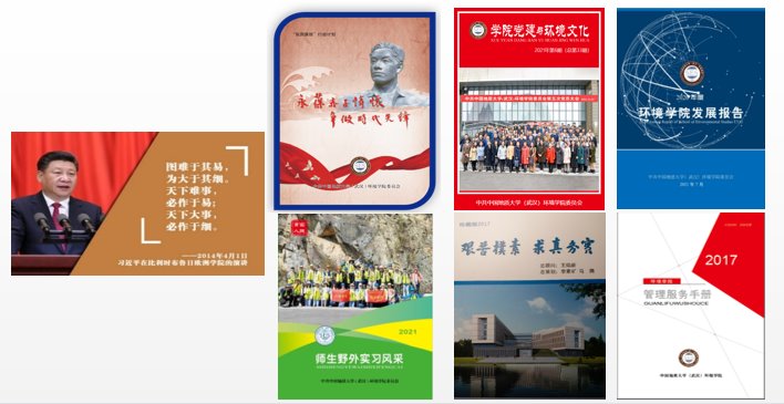 学院党委开发了《我最喜爱的习近平总书记的一句话》名信片、院刊《学院党建与环境文化》、院歌《艰苦朴素 求真务实》、《肉视频
