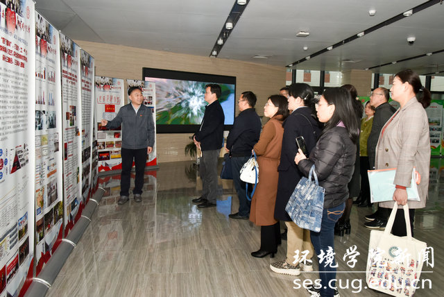 党建“双创”工作成果展板,李素矿重点讲解学院基本概况、党建工作体系、三全育人改革、跨学科教育研究、张国旗班行动计划、“4+N”美丽中国课程思政、“1+6”党建资政育人载体、兄弟院校交流互鉴、领导关怀指导和社会媒体反响等十个方面,全面反映了学院党委近年来党建示范创建和质量创优工作取得的创新性理论成果、制度成果、实践成果和特色成果,是环境人干事创业、追求卓越的汗水结晶。