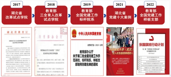 学院党委2006年被湖北省评为“高校先进基层党组织”,2009年被湖北省委高校工委评为“大学生思想政治教育先进基层单位”、被湖北省教育厅评为“普通高等学校开展学生阳光体育运动先进基层单位”,2011年被中共湖北省委高校工委、湖北省教育厅评为“两访两创”活动先进单位,2017年入选湖北高校试点改革学院,2018年入选教育部首批“三全育人”综合改革试点学院,2019年学院党委入选第二批全国党建工作标杆院系,2021年学院党委“注入红色基因铸魂育人”入选2019--2020年度湖北省十大党建案例(湖北高校唯一),2022年学院“张国旗班”党支部入选第三批“全国党建工作样板支部”。