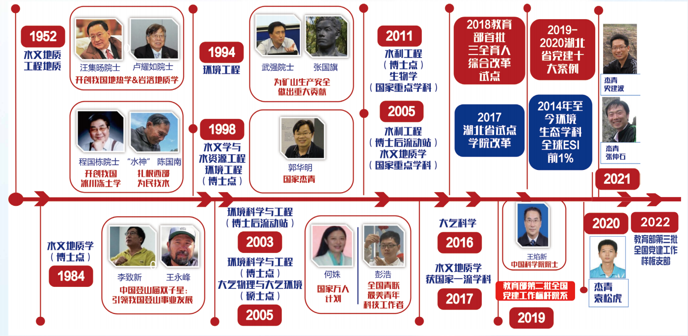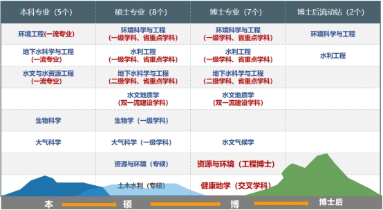 进一步优化学科生态,推进双一流建设。学院现有环境科学与工程、水利工程、地质学(共建)、地质资源与地质工程(共建)4个博士后流动站。环境科学与工程、水利工程2个一级学科博士点,水文地质学、地下水科学与工程二级学科博士点;有环境科学与工程、水利工程、生物学及大气科学4个一级学科硕士点,以及资源与环境、土木水利两个专业学位点。其中,水文地质学属国家一级重点学科的二级学科,环境科学与工程、水利工程、地下水科学与工程为湖北省重点学科。
