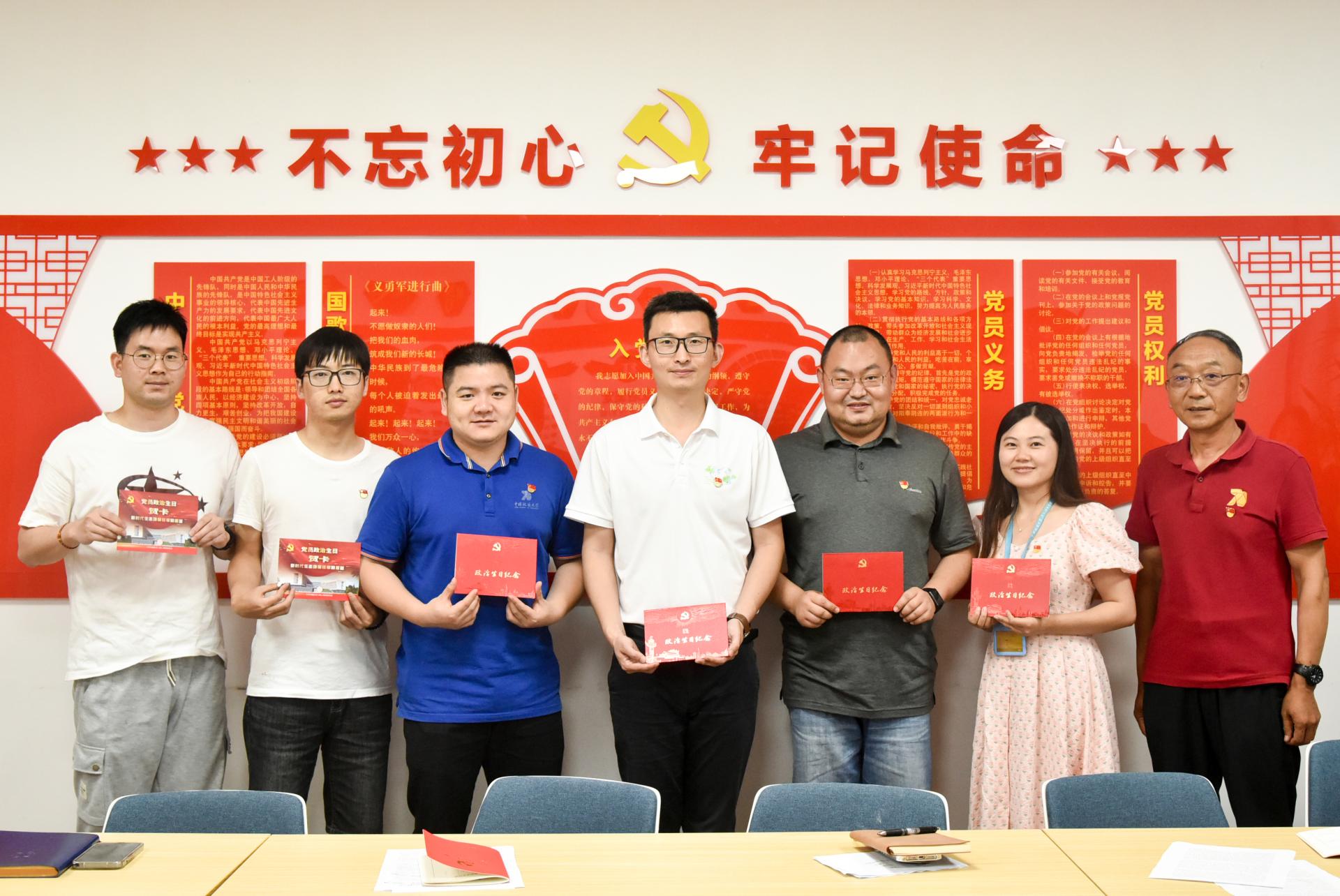 张学海为院直支部王海锋、杨涛、严丽莎、陈俊男同志和2021级博士生党支部的冯智、李越南等颁发政治生日纪念卡。
