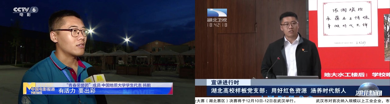 CCTV-6采访“青春荣誉团”成员韩鹏(左)、湖北卫视报道韩鹏宣讲党的二十大精神(右)
