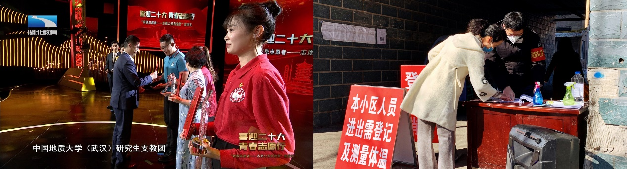 时任湖北省副省长宁咏为宣讲人韩鹏颁奖(左)、疫情期间韩鹏在社区卡点担任防疫志愿者(右)