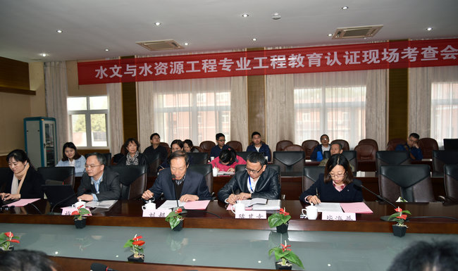 张学海)2017年11月1日上午在惠宾楼会议室,召开水文与水资源工程专业工程教育认证现场考查会。中国工程教育专业认证协会考查组组长、扬州大学原副校长刘超教授,考评组成员、武汉大学水利水电学院副院长梅亚东教授、广东省水文局教授级高级工程师陈其幸,秘书西安工业大学李 静教授、 常州大学毕海普,学校党委副书记、纪委书记成金华,教务处、学工处、人事处、财务处、校团委、图书馆、设备处、网络中心、地学院、数理学院、外语学院、信息中心等单位负责人,肉视频