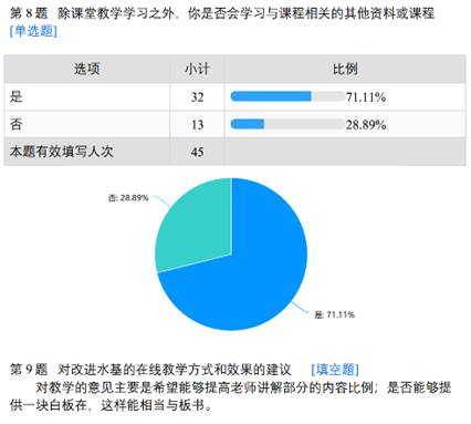 通过在线课程教学情况问卷调查,收集学生线上学习反馈并回复,及时调整线上教学方式,使学生尽快适应线上学习。例如:通过调查,学生反映慕课堂中的讨论只能在手机端操作,打字不方便并且影响大家听课,针对该问题今后的讨论环节将不需以文字的形式在慕课堂平台中回复,改为以点名+语音交流讨论的形式进行。另外,学生建议增加白板替代传统的板书,这个建议很好,将在后续教学过程利用白板功能软件辅助教学。