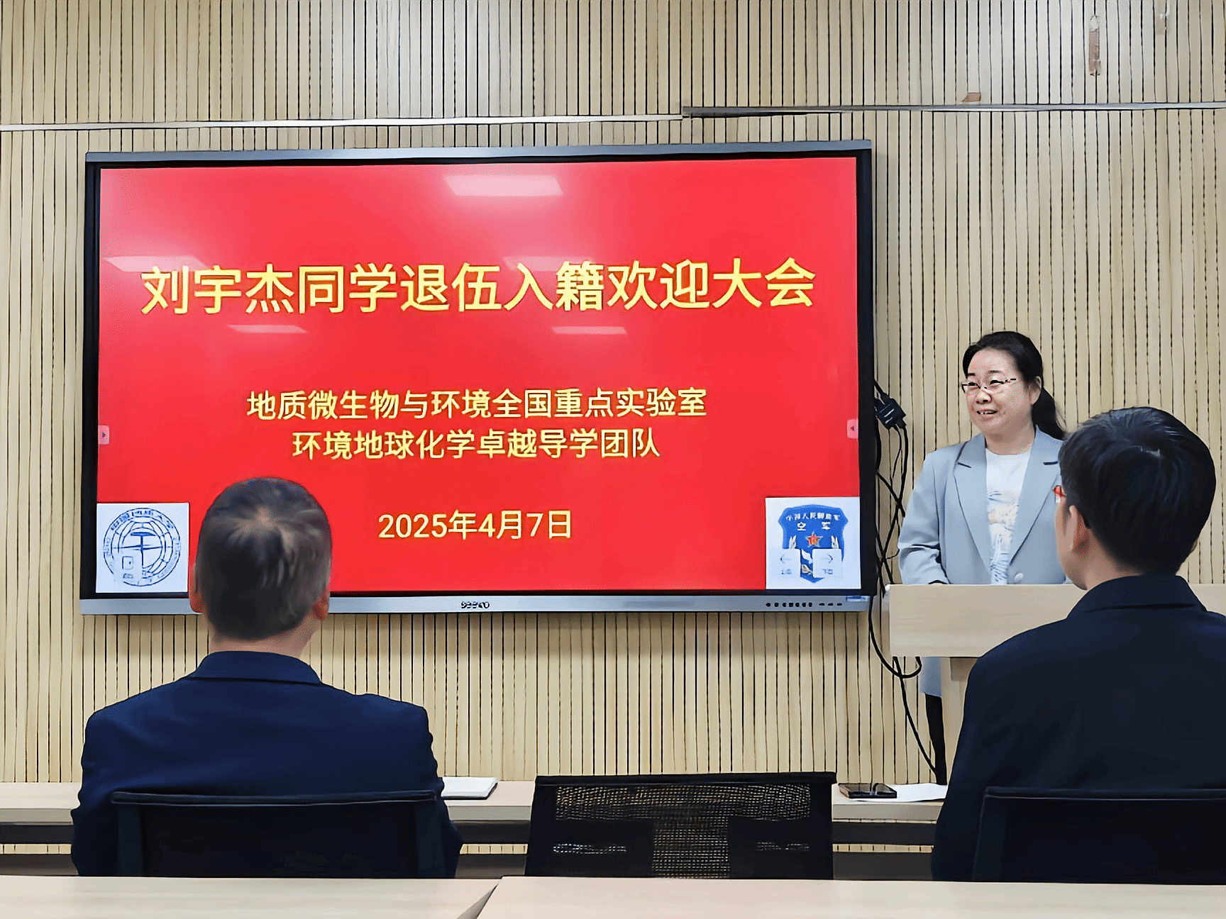 (通讯员晋冰洁 摄影侯碧茹 编辑王孟雪)4月7日,环境地球化学卓越导学团队刘宇杰同学退伍入籍欢迎大会在地质微生物与环境全国重点实验室B106会议室举行。党委研究生工作部部长许德华、地质微生物与环境全国重点实验室办公室主任侯建湘、环境地球化学卓越导学团队师生与研究生会代表参会。欢迎会由导师祁士华教授主持。