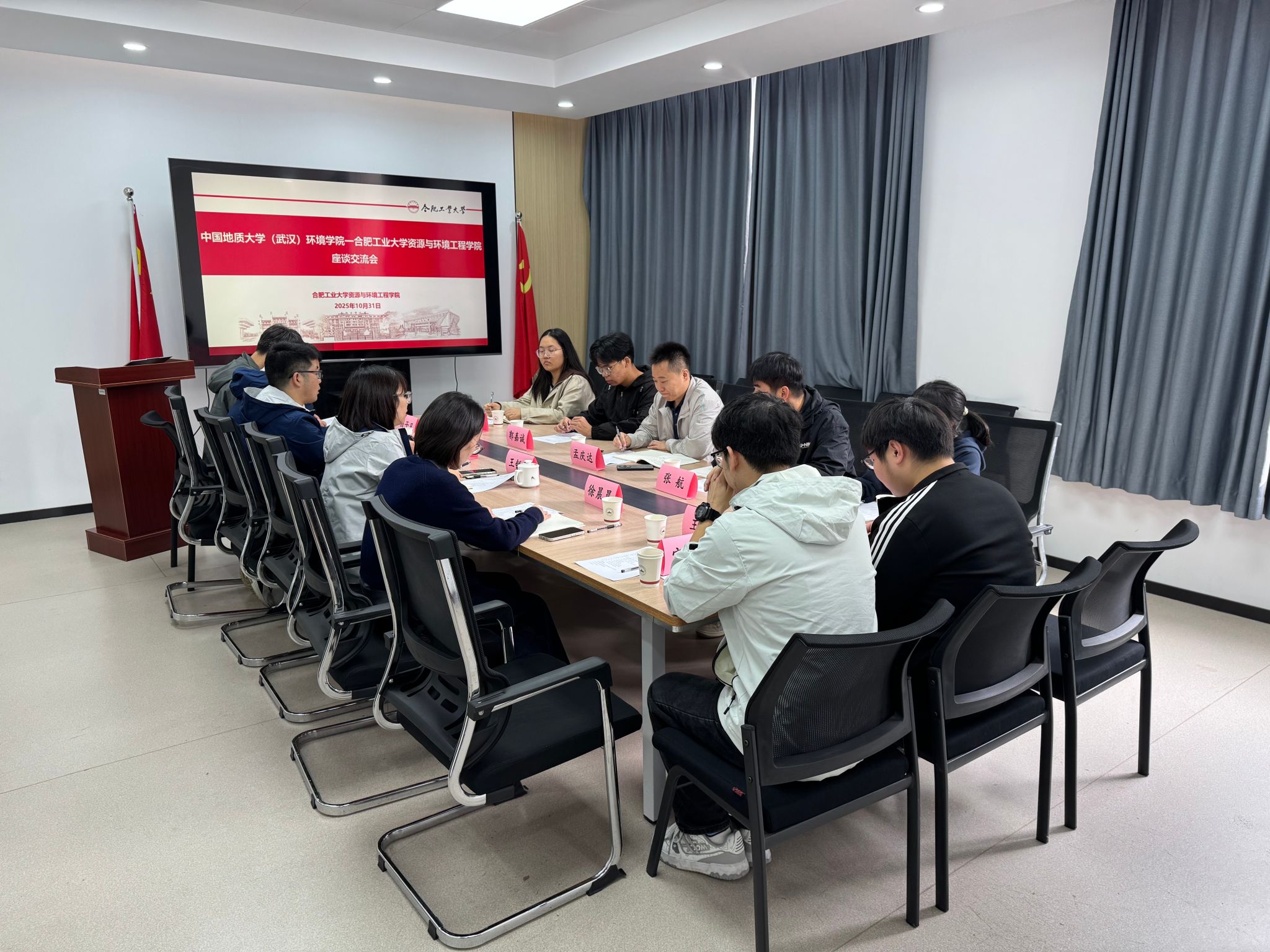师生与合肥工业大学资源与环境工程学院党委副书记兼纪委书记王锐琴,团委书记、辅导员朱大勇,学生工作办公室主任、研究生辅导员徐晨晨,本科生辅导员杨子凡、王正、王磊和学生党支部书记等交流座谈。双方围绕学生党建工作模式、思政育人体系建设、科普育人品牌、“第二课堂”学生评价体系等方面开展交流,在交流中碰撞思路、互学互鉴,并表示将保持常态化交流学习,共建“薪火驿站”,推动双方学生党建和思政工作提质增效。