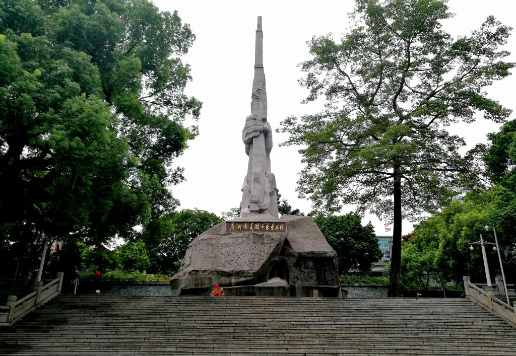 走出博物馆,来到广场。远处,一座巨大的石刻雕像耸然伫立,那是广州起义烈士纪念碑。雕像基座刻画的是战斗时的情景,碑文之上是被一只手紧握绑着象征起义的红飘带的步枪,象征着革命烈士不畏强暴、武装抗争的战斗精神。
