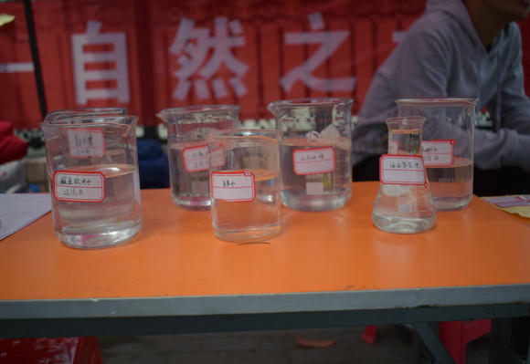 水实验为了增强互动性,分别从西区荷花池、北区水塘、东区池塘、东湖、宿舍饮用水、宿舍自来水以及矿泉水采取七组水样展示。环保志愿者帮助青年通过便携式水质检测设备,亲身体验水质检测以及电导率、pH值等指标的观测记录,吸引了众多在校学子、外国留学生和校友积极参与其中。