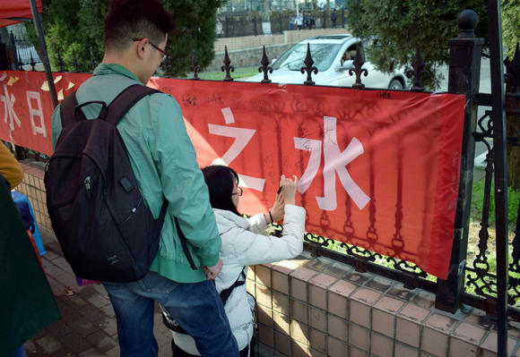 参与同学纷纷在“自然之水——世界水日”的横幅上签名,并在便利贴上书写家乡河湖的名字和保护水生态的号召,现场气氛热烈。
