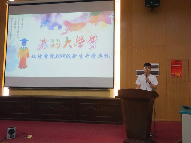 黄鹏作为2018级研究生新生代表发言。他以“脚踏实地,继往开来”为主题,讲述了作为大学生应该志存高远、目标清晰、追求卓越,努力实现自己的“大学梦”。