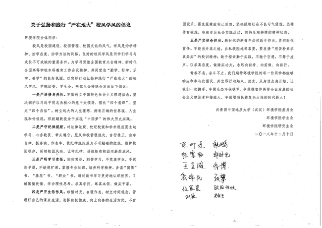 每位学子都能够积极响应、踊跃参与到弘扬和践行“严在地大”校风学风的倡议。他从“严”的词性分析出发,希望同学们严格于人、严肃于事、严处于物。“严”既是立德树人的方法要求,也是应该遵循的育人规律。通过“严管”与“厚爱”,将学生培养成卓越的精英,培养成生态环保铁军,培养成德智体美劳全面发展的社会主义建设者和接班人。