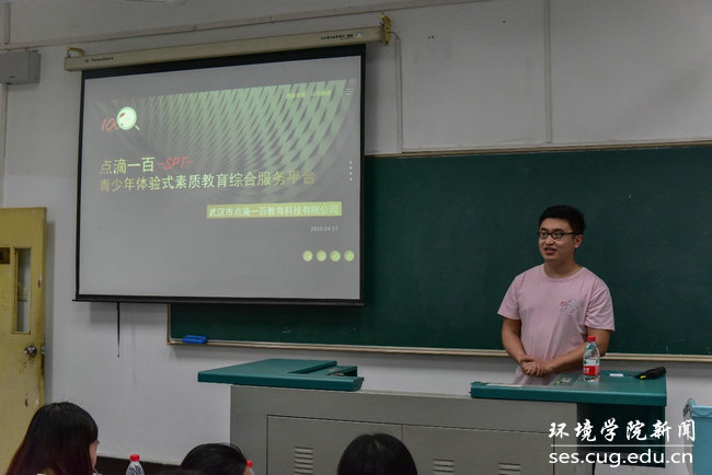 我校2017年度十大创业先锋郭科赶,向同学们介绍他创立点滴一百教育科技公司的心路历程。郭科赶表示,同学们要敢想敢做,抓住大赛的机会提升自己,丰富自己的大学生活。