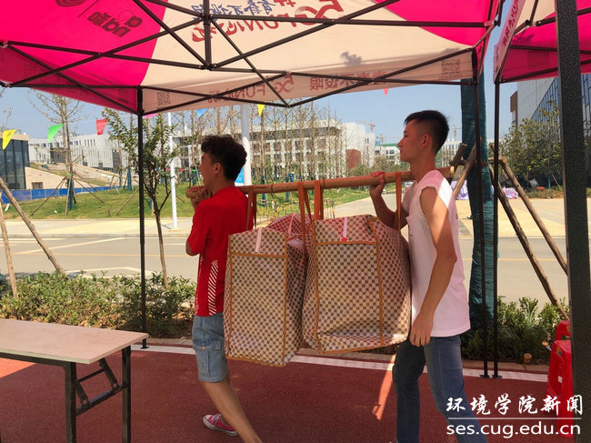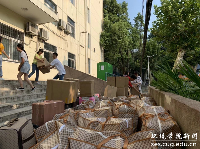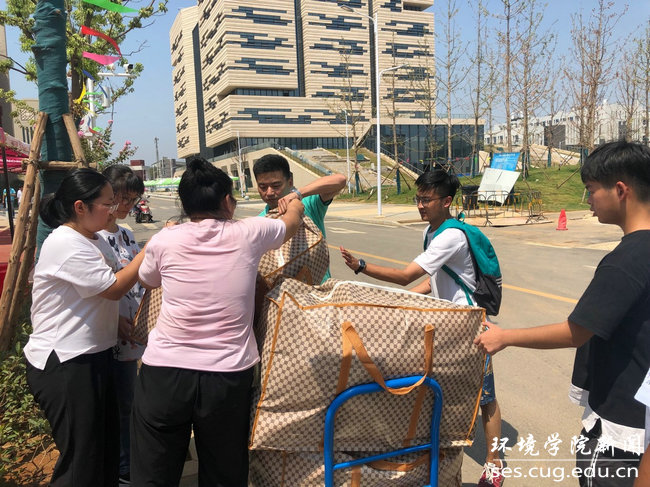 在搬迁过程中,学院学工组全体老师各司其职,与同学们一起奋战在搬迁工作第一线。同学们不喊苦不喊累,班级男生主动帮女生承担搬行李重任,遇到有困难的同学都会伸出援助之手,充分体现环境人耐劳苦、讲奉献的精神。在帮助同学们搬运行李的队伍中,还能看到不少志愿服务的同学。2016级韩鹏同学刚从外地支教回来,主动请缨加入到搬迁队伍中。他忙前跑后,额头上、衣服上都是汗。他说:“能为同学们多做点志愿服务,一起劳动出出汗,很有意义。”