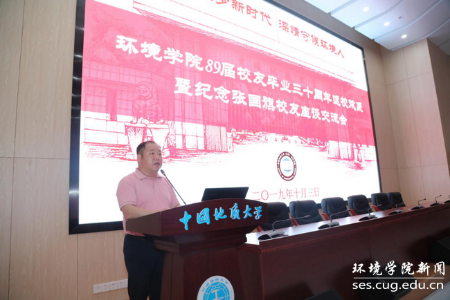 马腾致欢迎辞,并从历史沿革、学科建设、师资力量、学生培养等方面介绍学院近年来发展情况。他代表学院1800余名师生热烈欢迎校友们回家,对校友们长期以来关心学院发展、设立奖学金表示感谢,对校友们三十年来为国家改革开放作出的贡献、取得的卓越成绩表示敬意。他希望在校师生向校友们学习,弘扬“张国旗精神”,不忘初心、牢记使命,为地大梦、中国梦的实现不懈努力。