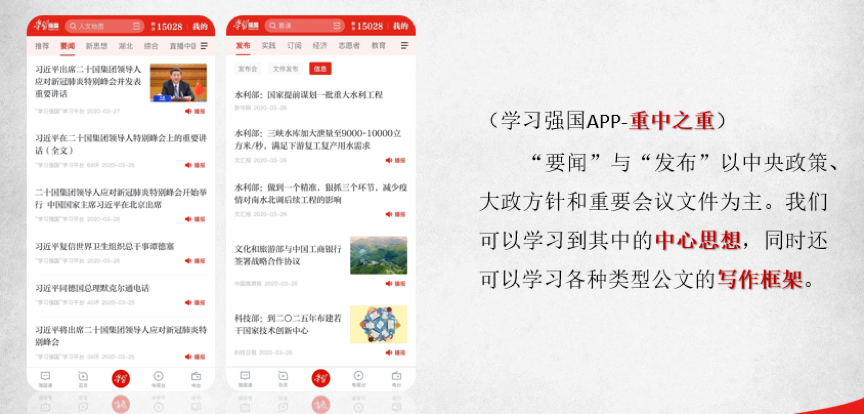 现在我每天早上洗漱的时候,还是会听早间新闻。与之前不同的是,现在是用“学习强国”APP新闻中的语音播报功能,非常的方便。早上我一般会听平台中“要闻”和“发布”这两栏的新闻。我认为这两栏推送的是最重要的文章,也是对我最有意义的文章。为什么这么说呢,因为这两栏推送的是中央政策、大政方针以及重要会议文件。这不仅可以让我了解、学习到其中的中心思想,同时我可以学习到中央文件所发布的指导意见、批复、通知函、会议通讯等各种类型文件的格式结构,也就是学习公文的写作框架。我想,我们每天阅读三五条,时间久了就会潜移默化的改变我们的语言词库,当然这对我日后的工作也会有很大的帮助。