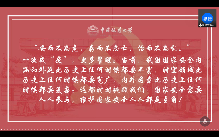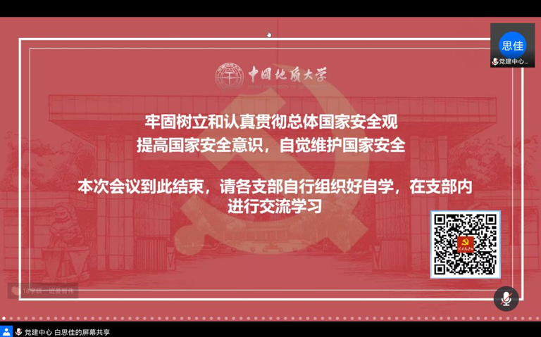 开展学生党支部四月线上联合主题党日,本次主题党日的主题为牢固树立总体国家安全观。学院党委副书记姜明敏、党建辅导员宋霖、全体学生党员参加会议,党建中心白思佳主持会议。
