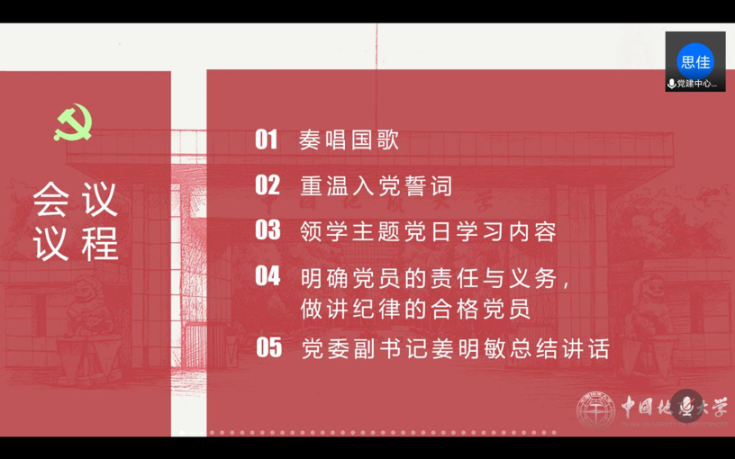 会议开始,全体党员合唱国歌并重温入党誓词。领学部分由水文专业大学生党支部书记毛烁宇和2019级学硕一班硕士研究生党支部书记张紫琼完成。