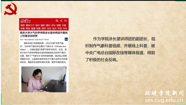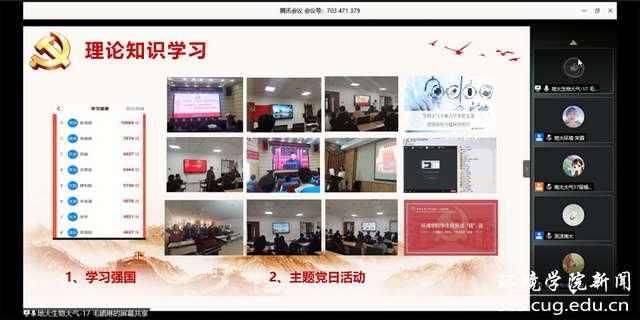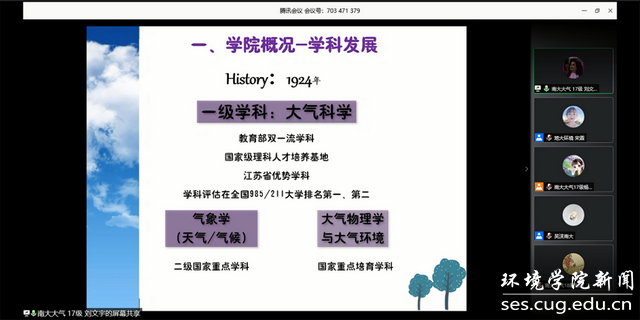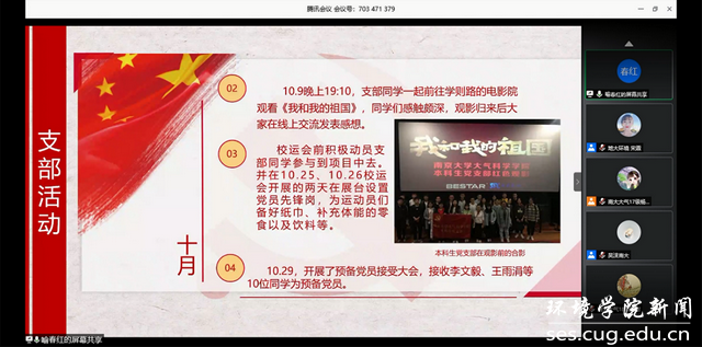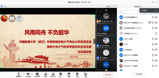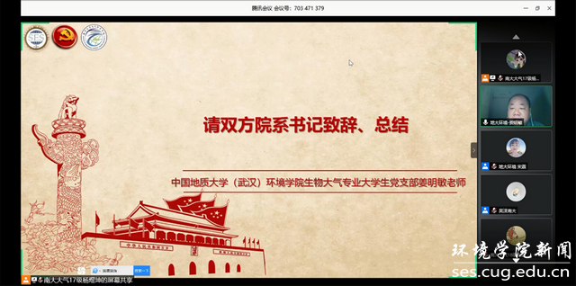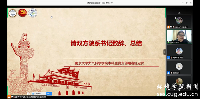 生物大气专业大学生党支部与南京大学大气科学学院本科生党支部通过腾讯会议举行了一场别开生面的云共建活动。南京大学大气科学学院党委副书记喻春红、辅导员吴沫,中国地质大学(武汉)肉视频
