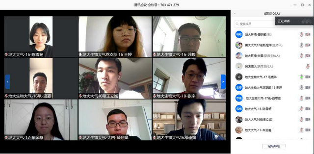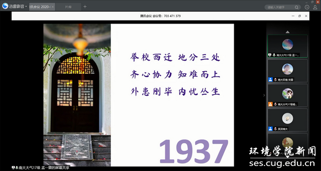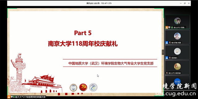 活动第五项,中国地质大学(武汉)为南京大学118周年校庆献礼,生物大气党支部全体成员打开摄像头,向他们表示了最真诚的祝愿:中国地质大学(武汉)肉视频