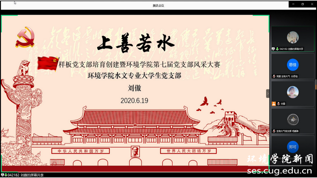 第七届党支部风采大赛答辩现场表现,结合提交的申报材料,经评委会评审、党支部互评,2019级博士研究生党支部、2018级学硕一班硕士研究生党支部、环境工程专业大学生党支部、水文专业大学生党支部、2018级学硕二班硕士研究生党支部获批院级学生样板党支部,同时2019级博士研究生党支部获得第七届党支部风采大赛一等奖,2018级学硕一班硕士研究生党支部、环境工程专业大学生党支部获得二等奖,水文专业大学生党支部、2018级学硕二班硕士研究生党支部获得三等奖。