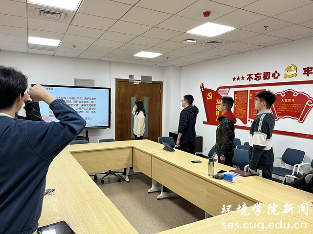 主题党日活动会议上,各支部学生党员唱国歌、温誓词。