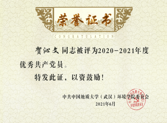 贺沁文被评为学院2020-2021年度优秀共产党员