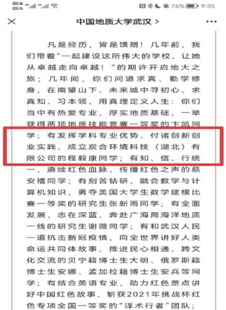 官微等媒体平台对团队事迹进行了深入的宣传报道,讲述环境人的故事,彰显环境人的时代风采。在学校2022届毕业生的毕业典礼上,中国地质大学(武汉)校长王焰新院士进行了题为“荣光与挫折”的讲话,团队负责人程毅康在王焰新校长的发言中被提名,“炭合”团队还被王焰新校长寄语“炭合团队,大有可为”。