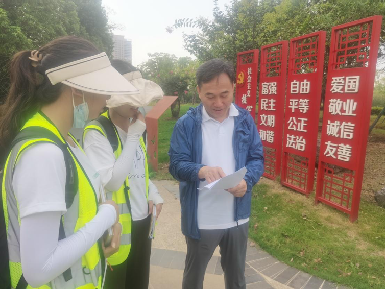 上午8点,李素矿一行同2021级环境科学与工程大类专业04H214、04H215和04H216班学生参加光谷三路湿地公园野外实习教学路线。在带班老师鲍建国老师的讲解下,他和同学们一起观察认识湿地公园中用于处理污水处理厂排放尾水的主要植物类型及特点,学习湿地公园污水处理系统的功能作用、工作原理及景观设计方法。同时,他询问了解同学们近期实习的学习生活情况。