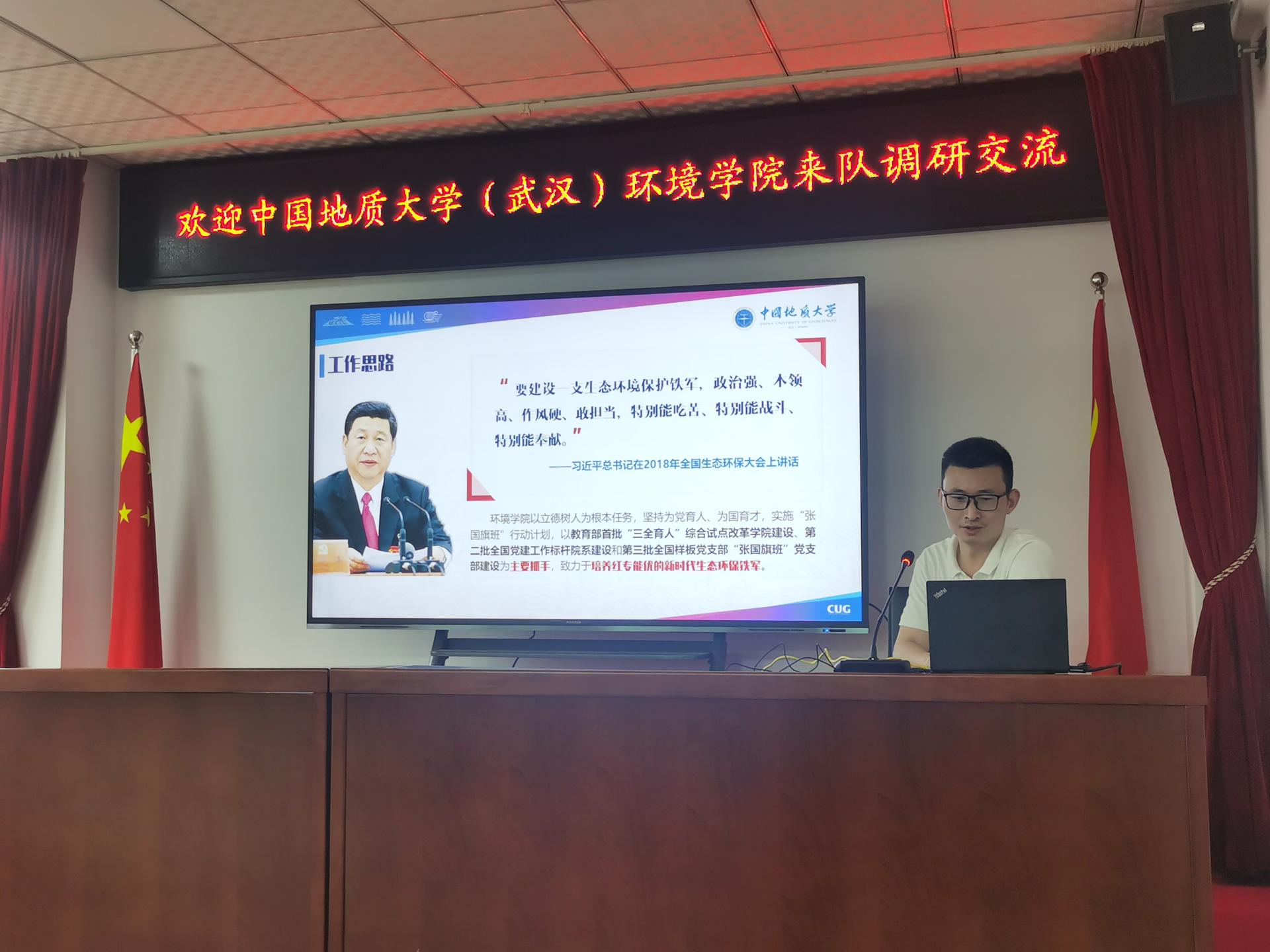 温汉辉对师生一行的到来表示欢迎,从组织架构、主要业务、品牌建设等详细介绍了九四〇队的基本情况。他重温自己在地大求学的时光,感谢学校老师们对自己的帮助,赞扬地大学子具有学习能力强、专业知识扎实、肯吃苦的优秀品质,表示来队工作的地大毕业生都成长为各部门的骨干人员。温汉辉表示未来九四○队将更加重视科研,成立科研创新基金,希望未来在生态环境等领域与学校展开深度合作,理论与生产相结合,开创互惠互利、合作共赢的新局面。