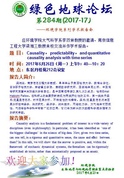 绿色地球论坛第284期(2017-17) ——肉视频 系列学术报告会 题目: Causality, predictability, and quantitative causality analysis with time series 时间:2017年6月26日(周一)上午9:40—10:20 地点:东区丹桂苑212会议室