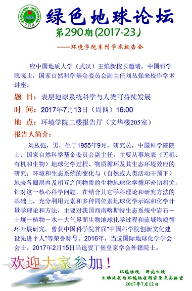绿色地球论坛第290期(2017-23) ——肉视频 系列学术报告会 题目:表层地球系统科学与人类可持续发展 时间:2017年7月13日(周四)16:00 地点:肉视频 二楼学术报告厅(文华楼205室)