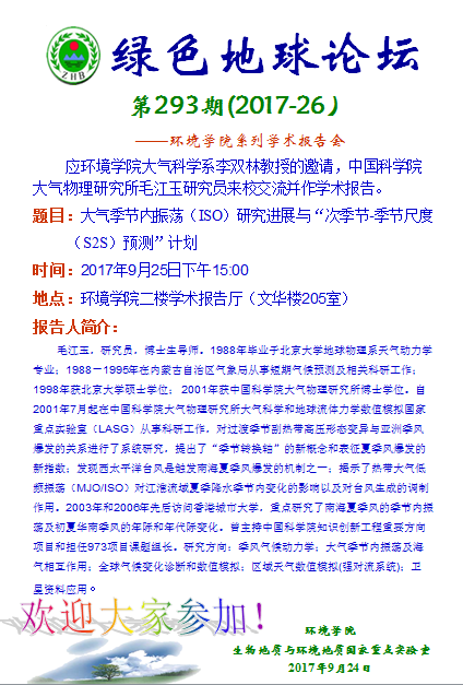绿色地球论坛第293期(2017-26) ——肉视频 系列学术报告会 题目:大气季节内振荡(ISO)研究进展与“次季节-季节尺度(S2S)预测”计划 时间:2017年9月25日下午15:00 地点:肉视频 二楼学术报告厅(文华楼205室)