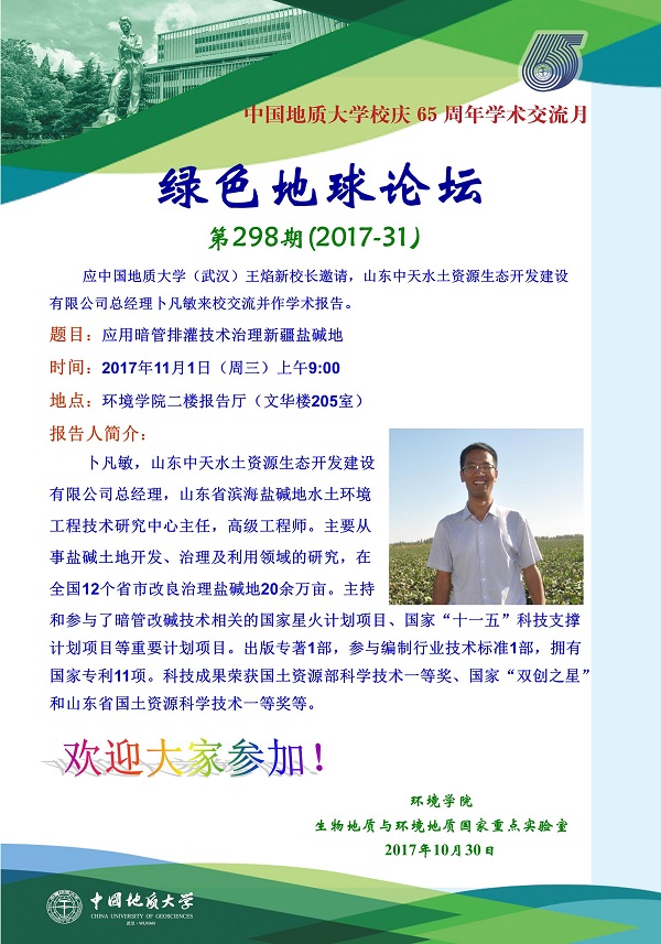 题目:应用暗管排灌技术治理新疆盐碱地 时间:2017年11月1日(周三)上午9:00 地点:肉视频 二楼报告厅(文华楼205室)