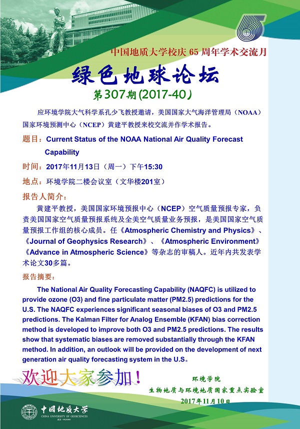 绿色地球论坛第307期(2017-40) ——肉视频 系列学术报告会 题目:Current Status of the NOAA National Air Quality Forecast Capability 时间:2017年11月13日(周一)下午15:30 地点:肉视频 二楼会议室(文华楼201室)