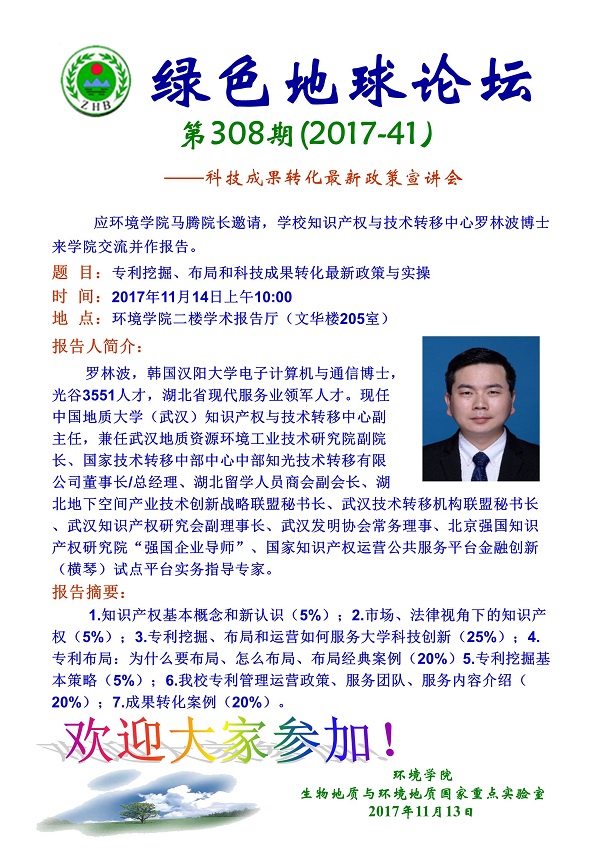 绿色地球论坛第308期(2017-41) ——肉视频 系列学术报告会 题目:专利挖掘、布局和科技成果转化最新政策与实操 时间:2017年11月14日(周二)上午10:00 地点:肉视频 二楼学术报告厅(文华楼205室)