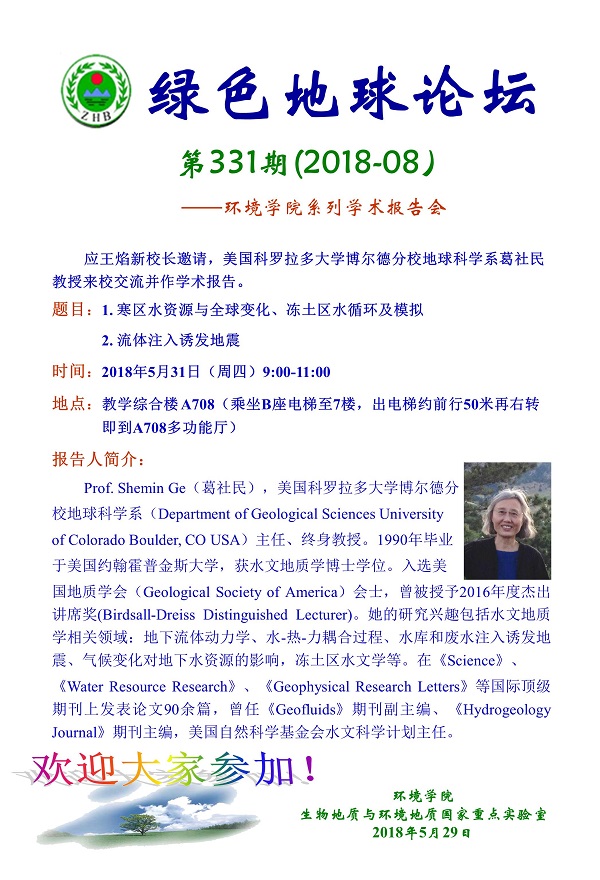 绿色地球论坛第331期(2018-8) ——肉视频 系列学术报告会 题目: 1. 寒区水资源与全球变化、冻土区水循环及模拟 2. 流体注入诱发地震 时间:2018年5月31日(周四)9:00-11:00 地点:教学综合楼 A708(乘坐B座电梯至7楼,出电梯约前行50米再右转即到 A708多功能厅)