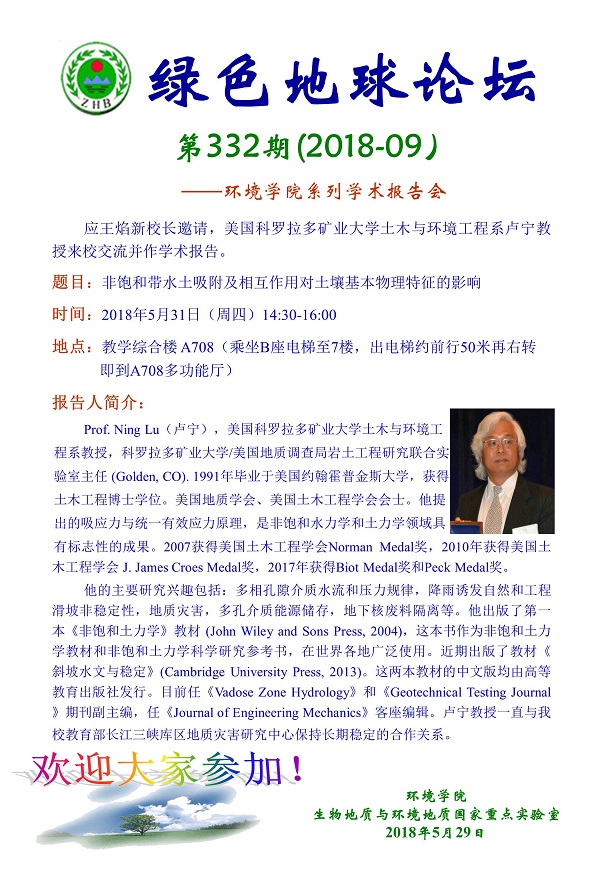 绿色地球论坛第332期(2018-9) ——肉视频 系列学术报告会 题目:非饱和带水土吸附及相互作用对土壤基本物理特征的影响 时间:2018年5月31日(周四)14:30-16:00 地点:教学综合楼 A708(乘坐B座电梯至7楼,出电梯约前行50米再右转即到 A708多功能厅)