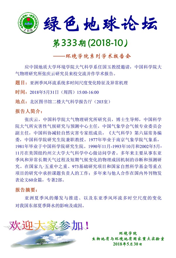绿色地球论坛第333期(2018-10) ——肉视频 系列学术报告会 题目:亚洲季风环流系统多时间尺度变化特征及异常机理 时间:2018年5月31日(周四)15:00-16:00 地点:北区图书馆二楼大气科学报告厅(203室)