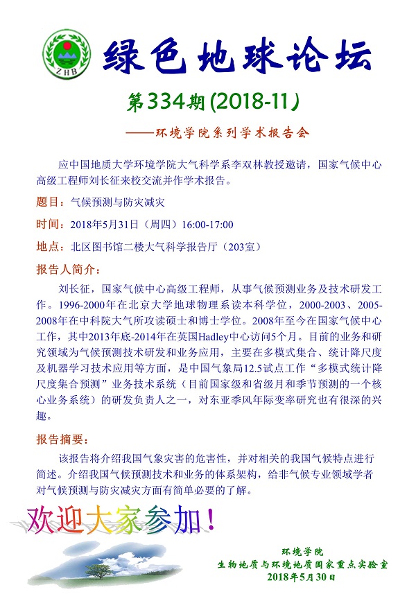 绿色地球论坛第334期(2018-11) ——肉视频 系列学术报告会 题目:气候预测与防灾减灾 时间:2018年5月31日(周四)16:00-17:00 地点:北区图书馆二楼大气科学报告厅(203室)